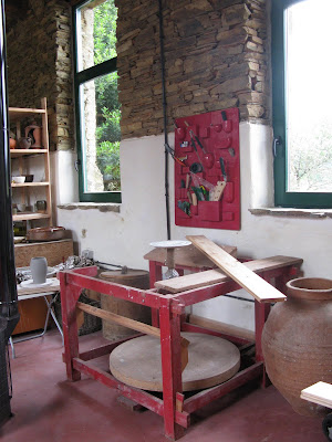 Un buen día conocí a José Vega y a Selito, su hijo, los alfareros de Faro, que venían a pescar al río Eo. Se acercaron a ver mi torno, y sobre la marcha, sin preguntar ni explicar, le arrancaron el motor y cambiaron el banco de sitio (para que me pudiera sentar con el plato a mi izquierda y no de frente). A continuación, con un trozo de cartón a modo de «tiradera» Selito torneó una jarra de sidra asturiana, según dice, la que mejor ha hecho hasta ahora!