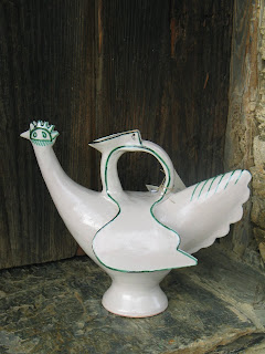 La gallina, que también es un botijo, tiene más decoración en las alas y la cabeza. Las dos figuras se llenan por una abertura superior, cerrada con una pequeña tapa con bisagra y vierten el agua por el pico .